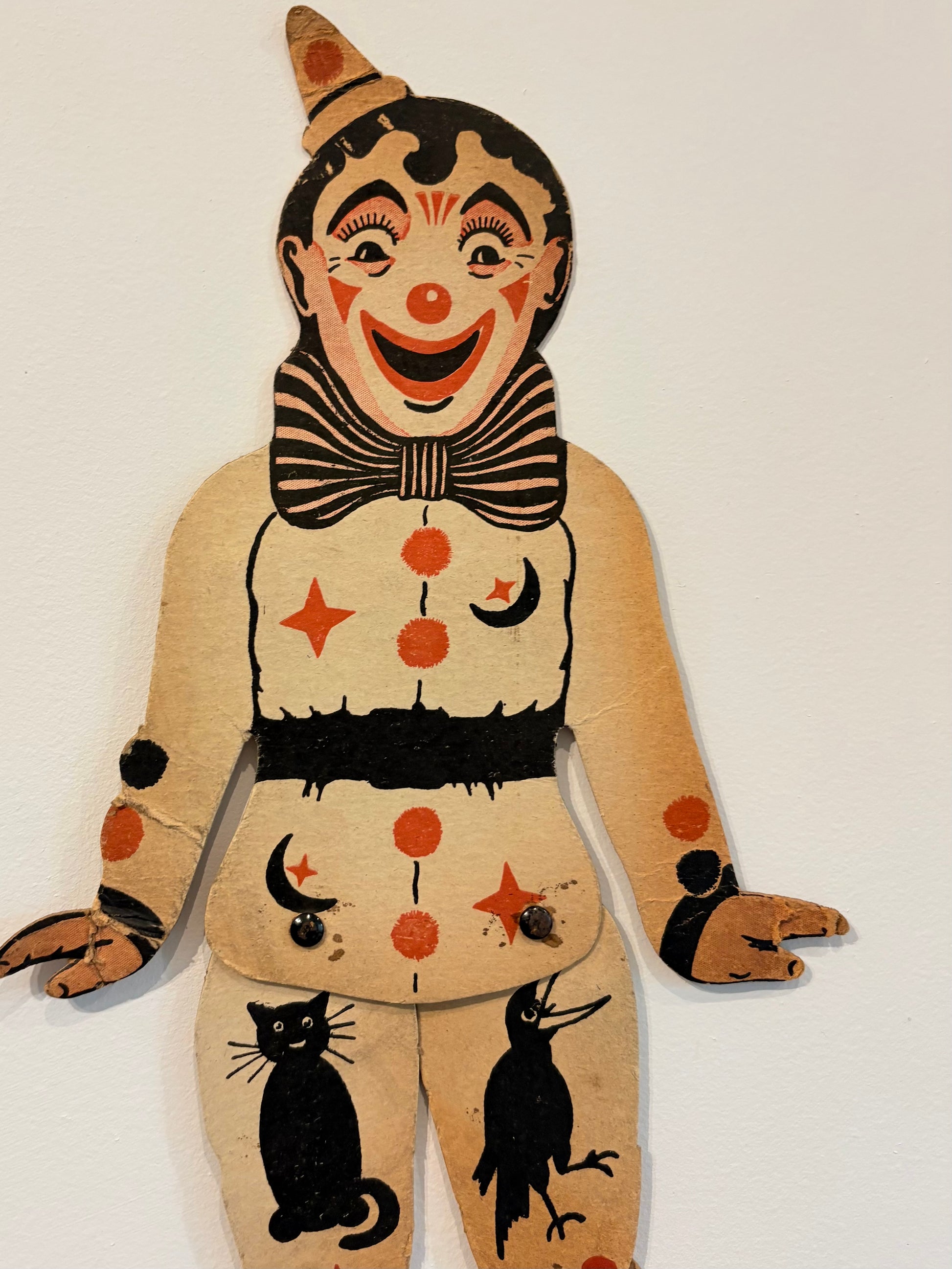 THE coolest 1920s (est) vintage Pierrot clown cardboard doll with pinned and fully moveable legs. Super unique piece of circus history here. Perfect for collectors of all things clown, retro interior, dolls and gothic oddities.